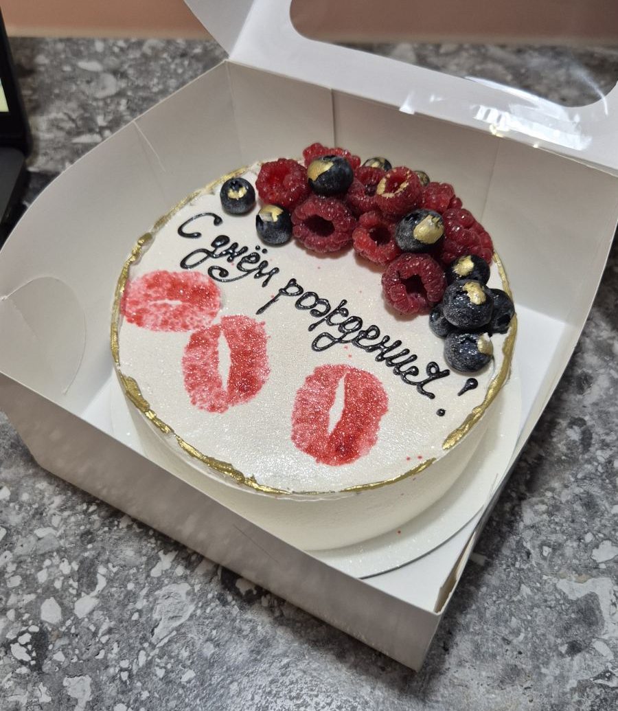Bento cake elegant, cu cremă albă sidefată, decorat cu zmeură și afine, urme de ruj roșu și mesaj aniversar – mini tort creat manual în laboratorul Emys Cakes, ideal ca și cadou senzual sau surpriză de zi de naștere. Alege combinația preferată de blat și cremă din umpluturile speciale pentru bento: https://emyscakes.md/umpluturi-bento/