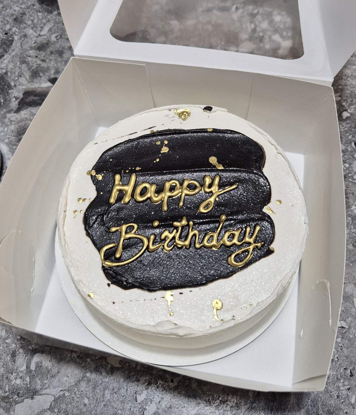 Bento cake minimalist alb-negru, cu cremă fină, decor negru texturat și detalii aurii, inscripționat „Happy Birthday”, creat manual în laboratorul Emys Cakes – mini tort elegant pentru aniversări la Chișinău. Alege combinația preferată de blat și cremă din umpluturile speciale pentru bento: https://emyscakes.md/umpluturi-bento/