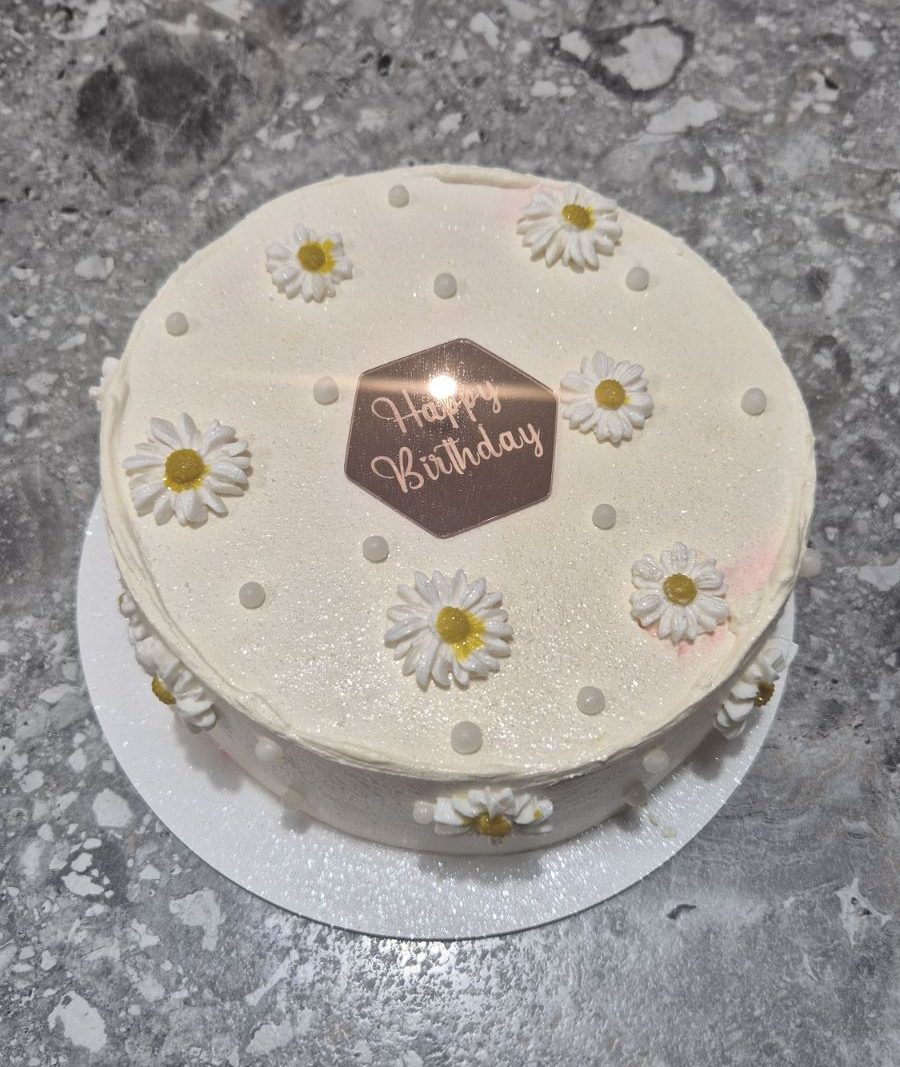Bento vesel „Happy Birthday” cu margarete galbene proaspete pe cremă albă sidefată roz delicat, accente hexagoane bronz strălucitor. Greutate 660-700g, preț 400 lei, cadou ideal aniversări primăvară. Alege din umpluturile bento la Emys Cakes Chișinău cu livrare ultra-rapidă!
