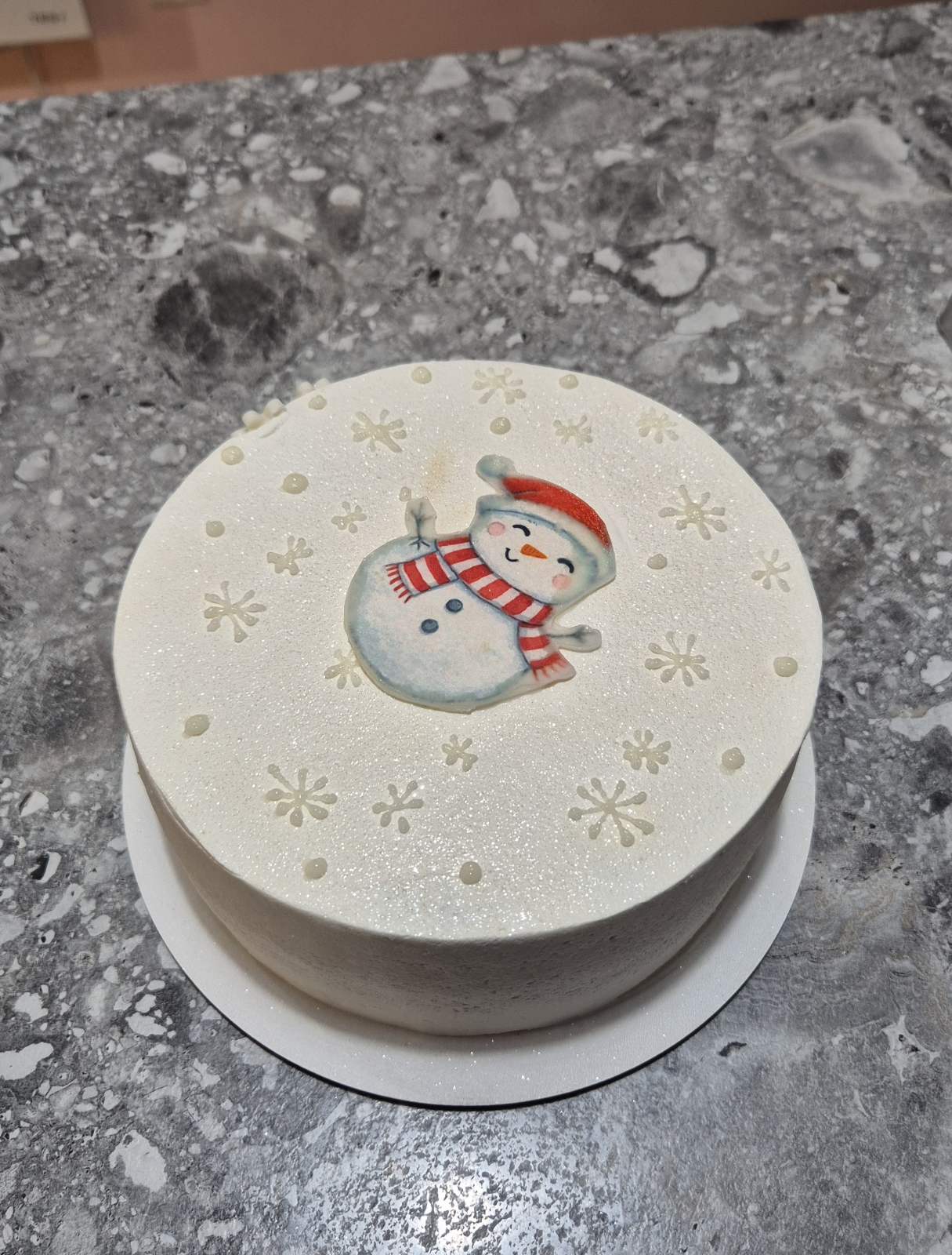 Bento tematic iarnă cu om de zăpadă zâmbăreț în șapcă roșie și eșarfă, înconjurat de fulgi pe cremă albă sidefată. Greutate 660-700g, preț 400 lei, perfect pentru sezonul rece. Alege din umpluturile bento la Emys Cakes Chișinău!
