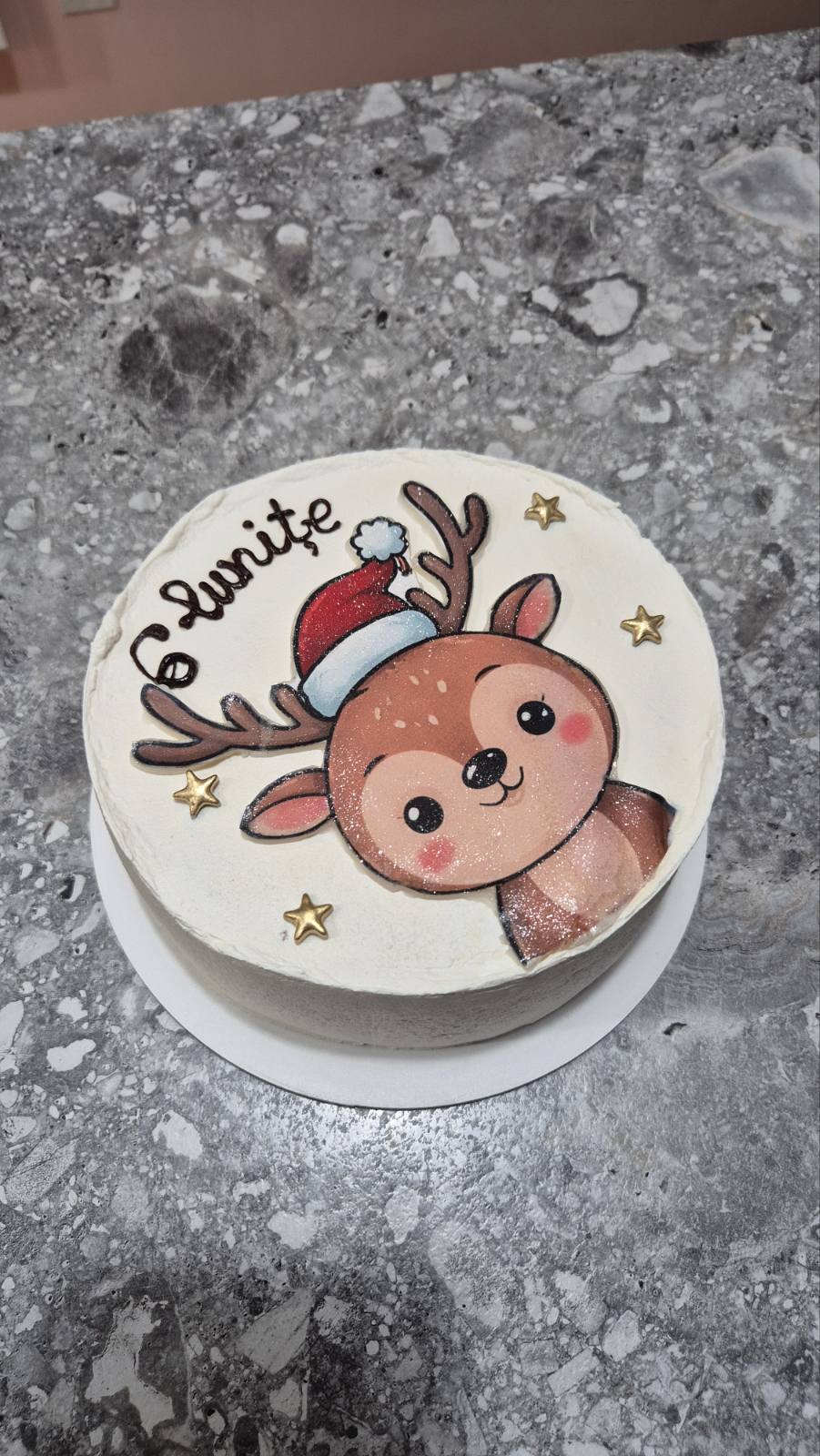 Bento festiv cu ren adorabil în șapcă roșie Santa, mesaj „6 luni” și stele aurii pe cremă albă. Greutate 660-700g, preț 400 lei, perfect pentru aniversări bebeluși. Alege din umpluturile bento la Emys Cakes Chișinău!