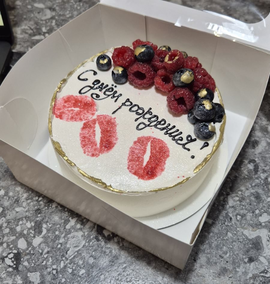 Bento elegant „С днем рождения” cu fructe zmeură aurite în buchet, două sărutări roșii și cremă albă fină. Greutate 660-700g, preț 400 lei, cadou ideal pentru aniversare. Vezi umpluturile bento la Emys Cakes Chișinău!