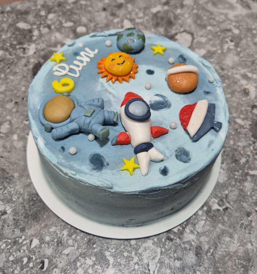 Bento tematic spațiu cu astronaut, rachetă, planete, soare și mesaj, pe cremă albastră stelată. Greutate 660-700g, preț 400 lei, perfect pentru copii aventuroși. Descoperă umpluturile bento la Emys Cakes Chișinău!