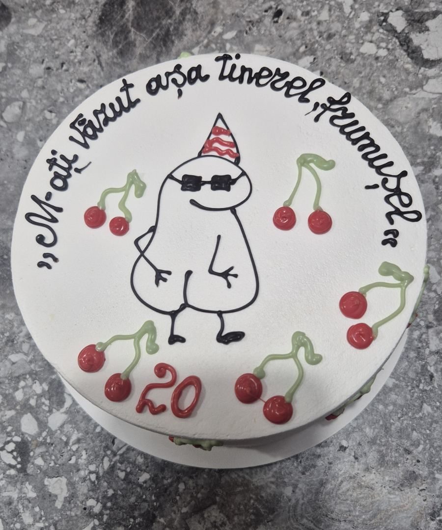 Bento tort haios alb cu personaj cool cu ochelari negri și pălărie party, cireșe roșii, cifra „20″ și mesajul „M-ați văzut așa tinerel, frumusel” – cadou perfect pentru aniversare 20 ani în Chișinău. Plin de umor și savoare. Alege din umpluturile pentru bento pentru gust irezistibil! Emys Cakes, râs dulce