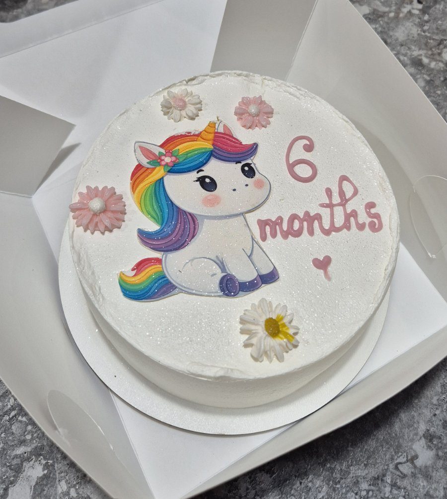 Bento tort magic pentru 6 months cu unicorn alb print curcubeu roz, „6 months” roz, flori roz și galbene, inimioară – adorabil pentru aniversare bebeluș în Chișinău. Compact și colorat. Descoperă umpluturile pentru bento pentru dulceață perfectă! Emys Cakes, bucurie pură.