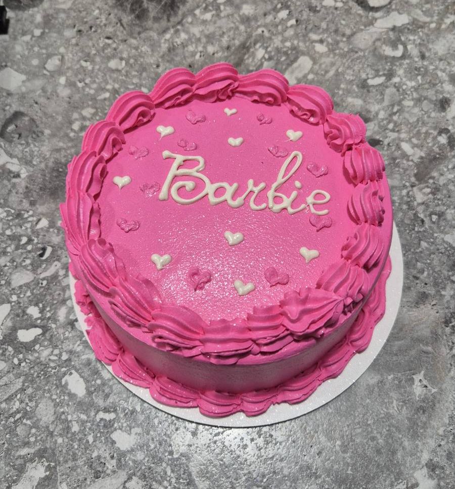 Bento tort spectaculos roz fuchsia cu inscripție elegantă „Barbie” albă, bordură din frișcă roz și inimioare albe – perfect pentru o aniversare de fetiță sau orice iubitoare de Barbie în Chișinău. Vibrant, dulce și adorabil. Alege din umpluturile pentru bento pentru gust irezistibil! Emys Cakes, vis roz.