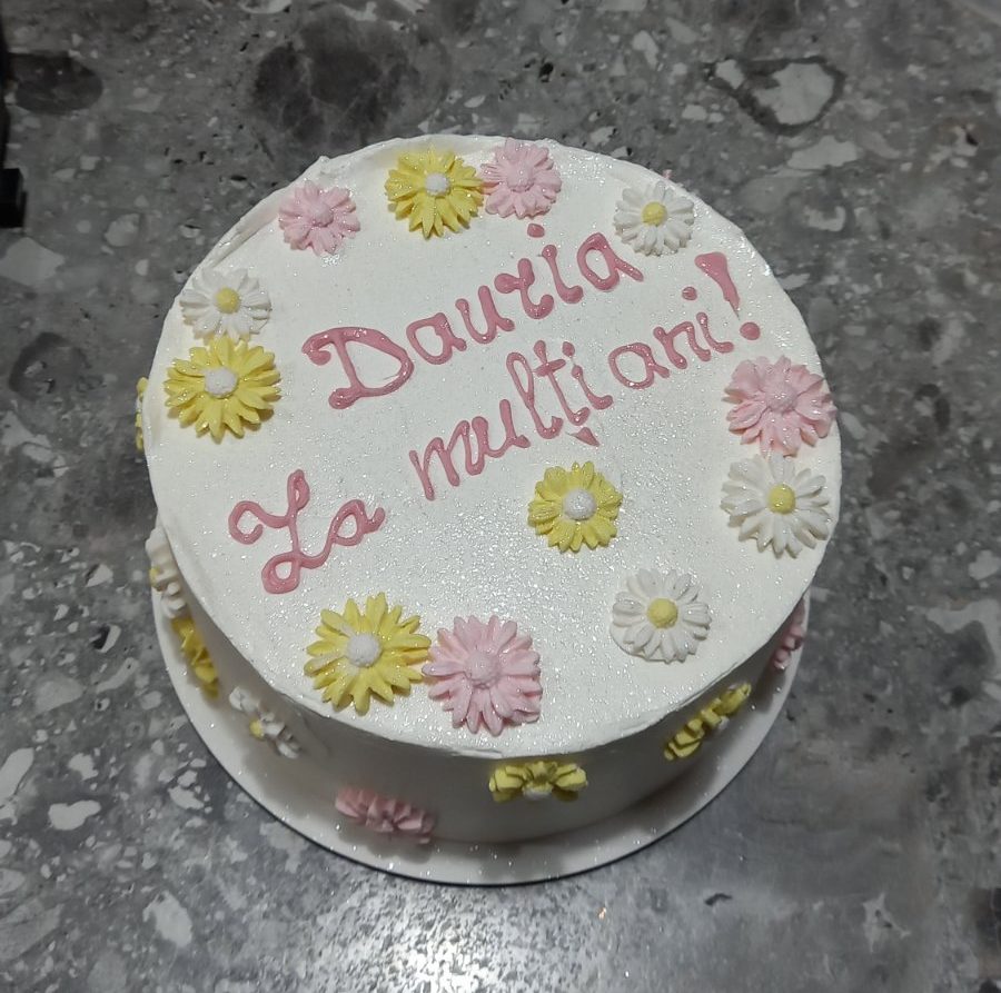 Bento tort vesel cu „Dauria la multi ani!” roz, margarete colorate galbene, roz și albe pe cremă albă – perfect pentru aniversare Dauria în Chișinău. Compact și festiv. Alege din umpluturile pentru bento pentru gusturi dulci! Emys Cakes, bucurie garantată.