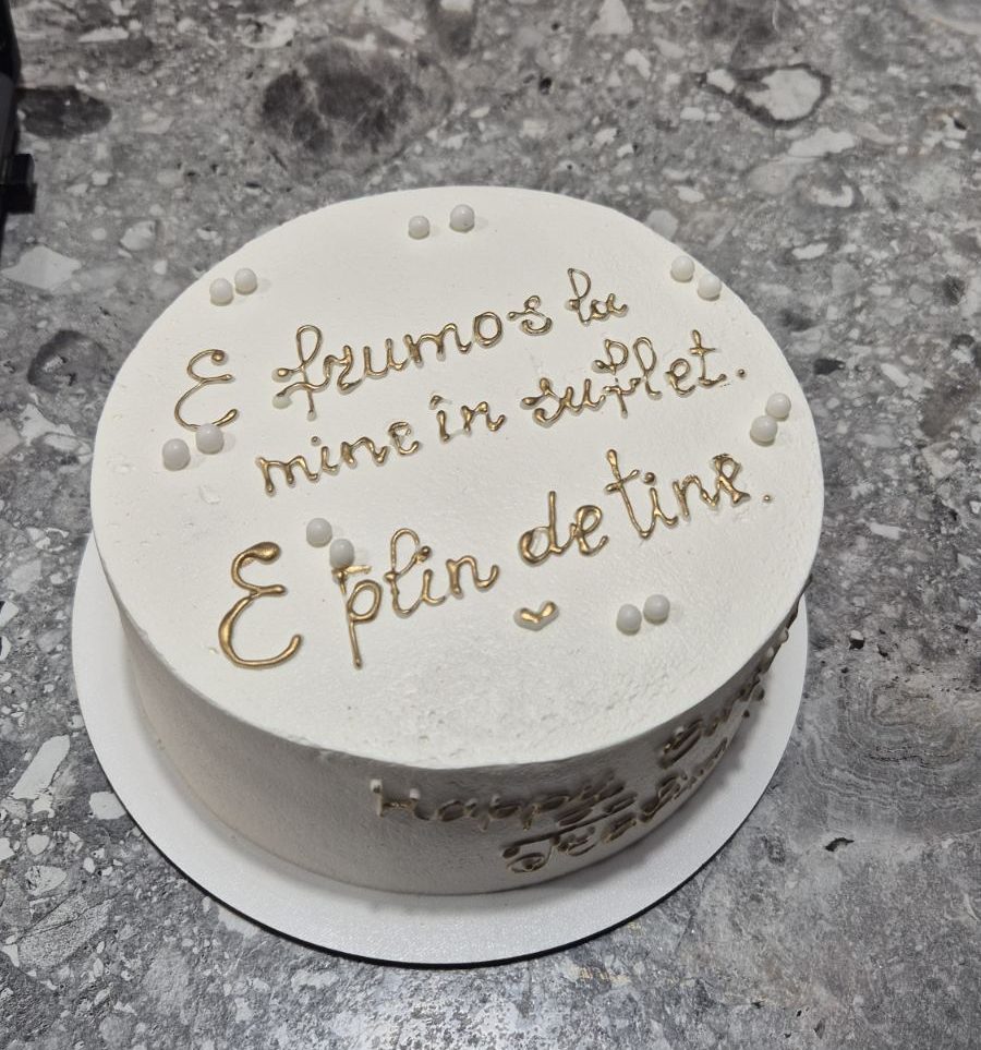 Bento tort delicios cu inscripție romantică „E frumos la mine in suflet.” și „E plin de tine” în aur elegant pe cremă albă cu perle – perfect pentru momente speciale în Chișinău. Compact și gustos, ideal pentru cadouri unice. Alege din umpluturile pentru bento pentru savoare maximă! Comandă acum de la Emys Cakes.