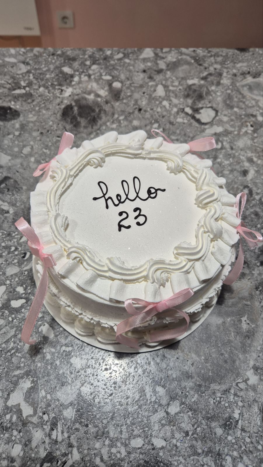 Bento tort elegant alb cu inscripție „hello 23″, frișcă în straturi, bordură ornamentată și fundițe roz satin – perfect pentru aniversare 23 ani în Chișinău. Feminin, rafinat și delicios. Alege din umpluturile pentru bento pentru savoare perfectă! Emys Cakes, zi dulce.