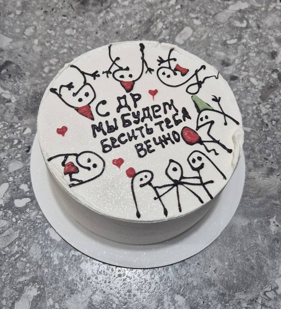 Bento tort haios alb cu figurine stick desenate, mesajul „С ДР мы будем бесить тебя вечно” și inimioare roșii – cadou perfect pentru un prieten cu simțul umorului în Chișinău. Unic, amuzant și delicios. Alege din umpluturile pentru bento pentru savoare garantată! Emys Cakes, râs și dulceață