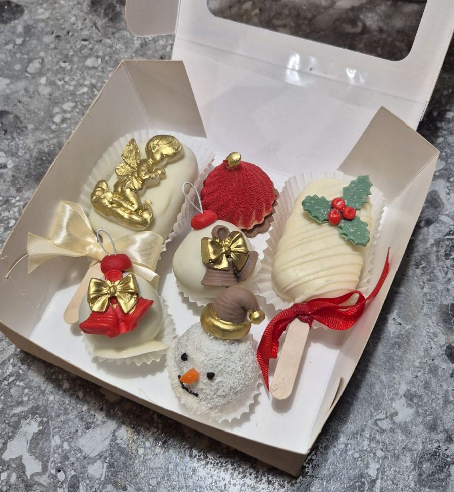Set de Crăciun elegant cu deserturi asortate în ciocolată albă, decorate manual cu îngeraș auriu, clopoței, om de zăpadă și detalii roșu-verzi – cadoul dulce perfect pentru sărbători, creat în laboratorul Emys Cakes din Chișinău. Combină-l cu un tort la comandă sau alte delicii din oferta noastră de seturi și candy bar.