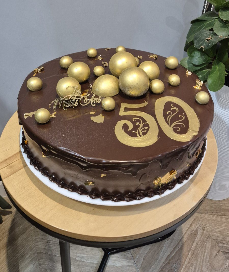 Tort aniversar de 50 de ani, acoperit în ganaj fin de ciocolată și decorat elegant cu bile aurii, cifra 50 pictată manual și topper „La Mulți Ani” – un tort masiv de 10 kg, perfect pentru aniversări masculine și evenimente de familie, creat la comandă în laboratorul Emys Cakes din Chișinău. Decorul se taxează suplimentar, iar prețul per kilogram se adaugă la costul de bază al tortului.