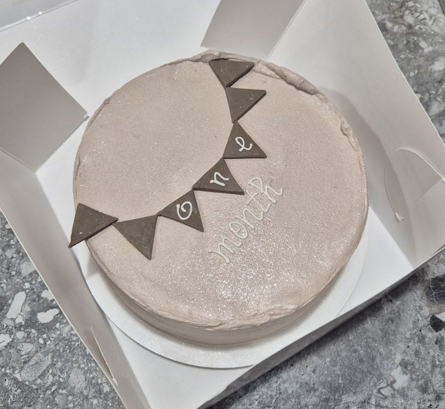Tort bento special pentru prima lună de viață, cu ghirlandă roz pal „1 MONTH” pe cremă bej lucios, de Emys Cakes cu umpluturi bento. Perfect pentru părinți din Chișinău care sărbătoresc micuțul.