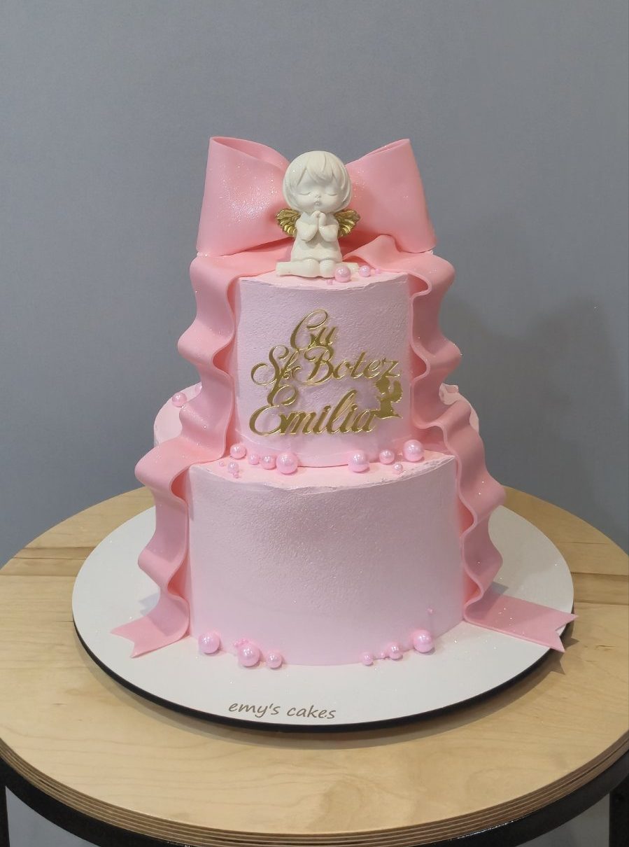 Tort elegant cu două nivele (minim 5 kg), acoperit în cremă roz, decorat cu fundă mare, îngeraș și perle. Potrivit pentru botez, cumetrie sau prima aniversare. Decorul complet costă 500 lei (îngeraș, fundiță, topper), platou metalic 300 lei (garanție). Personalizare tematică, alegere aromă din lista Emys Cakes. Livrare Chișinău și prezentare deosebită pentru eveniment special.
