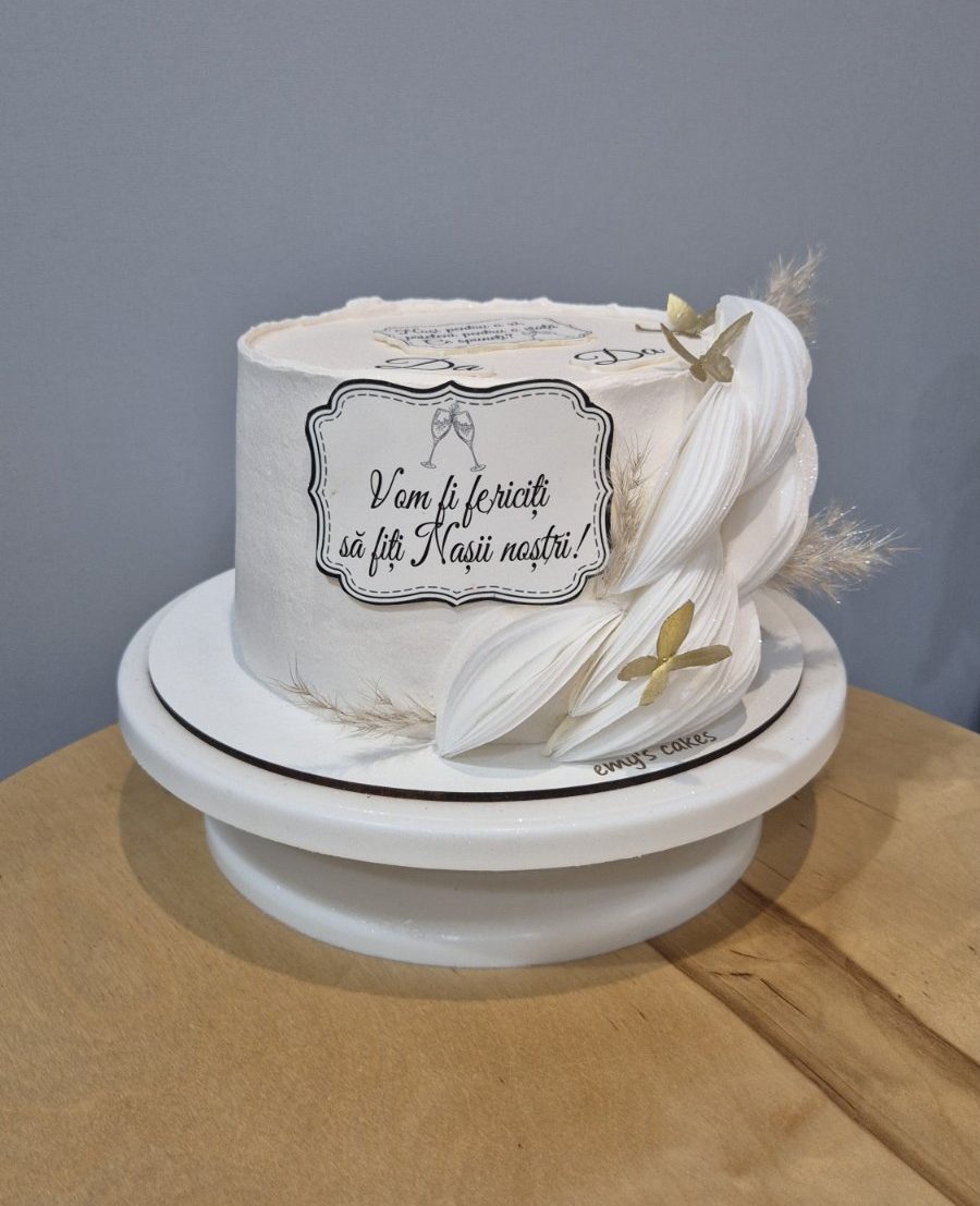 Surprinde-ți viitorii nași cu un tort elegant, acoperit în cremă cheese fină și decor unic din foi de orez (600 lei). Poți personaliza mesajul de pe tort pentru o cerere originală și memorabilă. Modelul din imagine are 2 kg – perfect pentru un moment intim în familie. Alege umplutura preferată din lista Emys Cakes. Livrare rapidă și prezentare impecabilă pentru orice eveniment important.