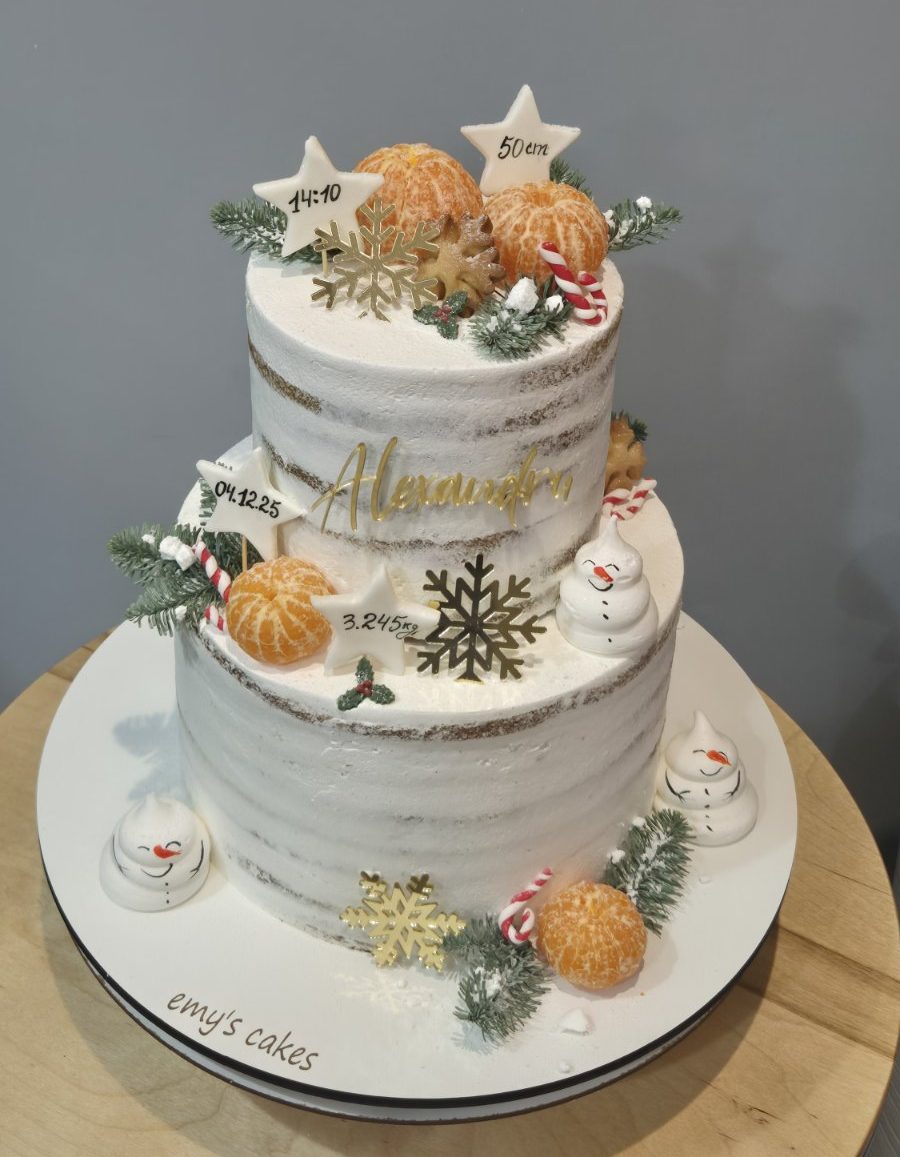 Tort festiv etajat de 5 kg acoperit în cremă albă rustic, decorat cu portocale întregi, stele aurii, fulgi de zăpadă, crenguțe verzi și numele Alexandru, perfect pentru sărbătorile de iarnă. Decorul costă 300 lei. Adaugă savoare cu umpluturile noastre pentru torturi de la Emys Cakes.