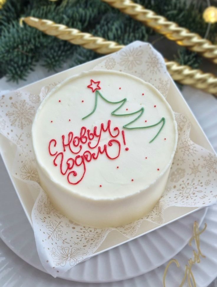 Tort rotund acoperit în cremă albă fină, decorat minimalist cu brăduț verde, steluță roșie și mesaj „С Новым годом!”, așezat pe șervețel cu motive de iarnă. Ideal pentru masa de Revelion, cadou festiv sau surpriză dulce pentru vorbitorii de rusă, disponibil la comandă în Chișinău.