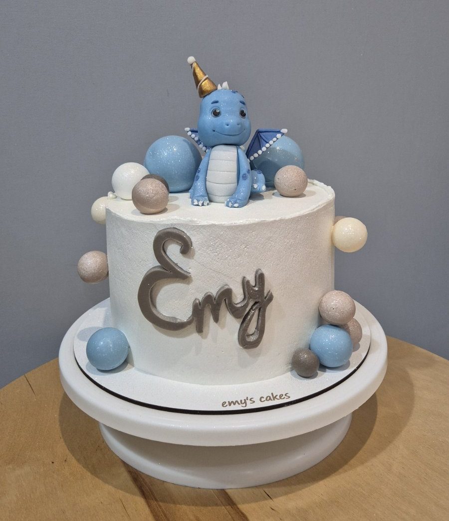 Tort fin acoperit în cremă de brânză, cu figurină dragon albastru modelată manual, globuri de ciocolată și inscripție „Emy”. Greutate 2 kg, decor exclusiv 980 lei. Alege din umpluturile noastre pentru torturi pentru perfecțiune de la Emys Cakes Chișinău!