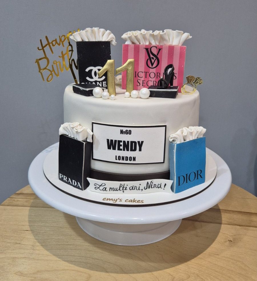 Tort elegant de 3 kg acoperit în pastă de zahăr albă (+180 lei/kg), decorat cu genți de lux Prada, Dior, Victoria’s Secret, Happy Birthday auriu și numele Wendy. Decorul costă 950 lei, perfect pentru aniversarea de 11 ani a iubitoarelor de modă. Alege din umpluturile noastre speciale pentru un gust unic la Emys Cakes.