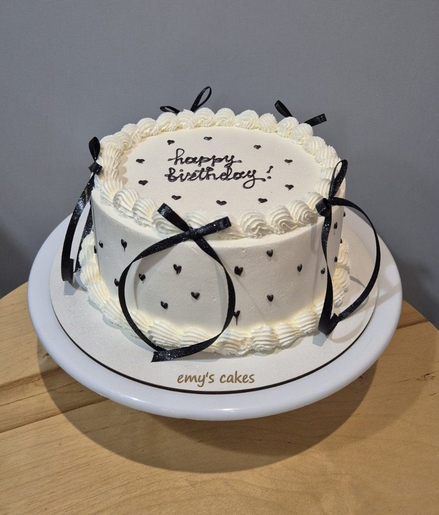 Tort aniversar elegant, acoperit în cremă de brânză, decorat cu fundițe negre, inimioare delicate și inscripția „happy birthday”, realizat handmade la Emys Cakes în Chișinău – un tort feminin și deosebit pentru zile speciale. Alege umplutura preferată dintre opțiunile noastre delicioase: https://emyscakes.md/umplutura-la-torturi/