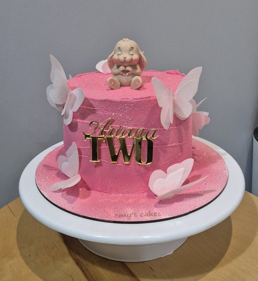 Tort roz cu efect de pudră, iepuraș adorabil, fluturași și topper „Ariana” pentru 2 anișori. Greutate 3 kg, decor premium 550 lei. Completează cu umpluturile noastre pentru torturi de la Emys Cakes în Chișinău!