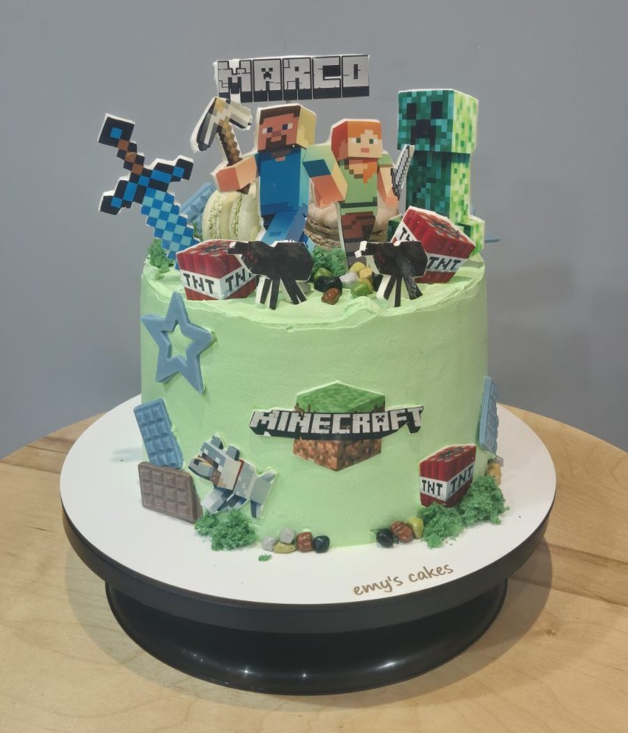 Tort tematic Minecraft de 2 kg, acoperit în cremă de brânză verde, decorat cu figuri Steve, Alex, creepers, săbii, topoare și numele Marco. Decorul costă 450 lei, ideal pentru fani pasionați. Completează cu umpluturile noastre speciale pentru o petrecere epică la Emys Cakes.