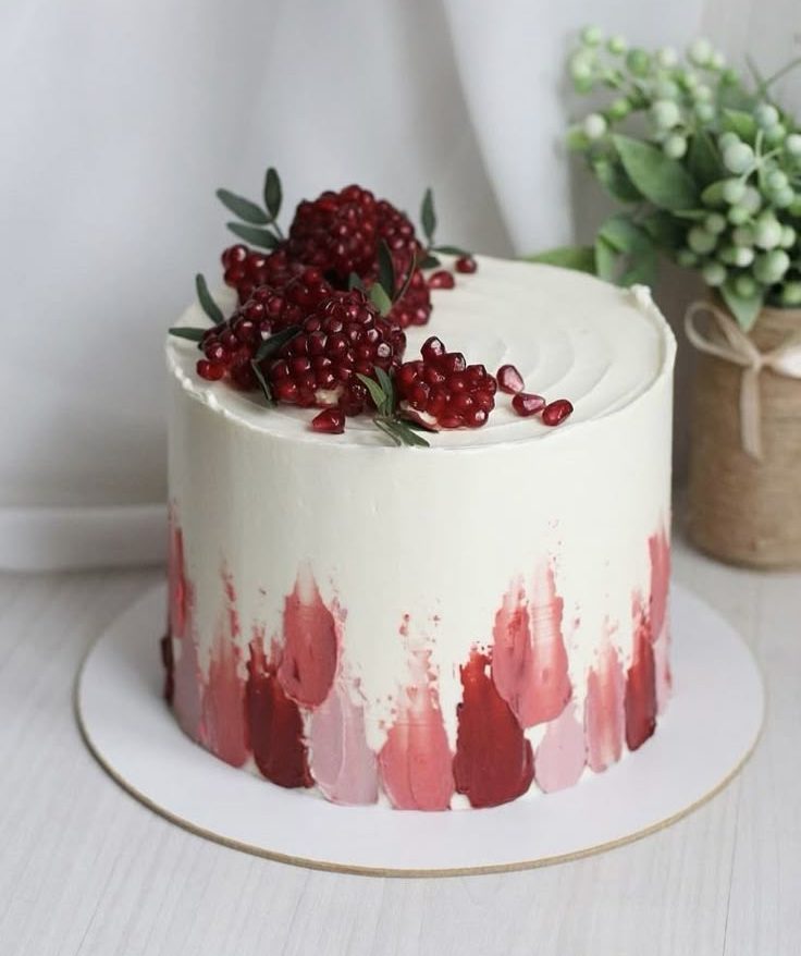 Tort înalt, acoperit în cremă albă fină, decorat artistic cu tușe verticale în nuanțe de roșu și roz pe laterale și cu jumătăți de rodie proaspătă și frunze verzi deasupra. Un tort modern, delicios și fotogenic, perfect pentru aniversări, nunți, botezuri sau evenimente speciale, disponibil la comandă în Chișinău.