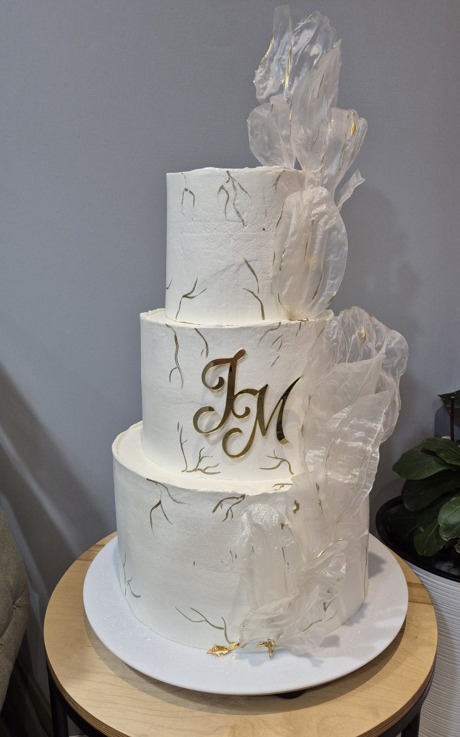 Tort de nuntă acoperit în cremă de brânză, decorat cu foi de orez translucide, detalii aurii și monogramă personalizată (decor 700 lei). Minimul este 10 kg, platou metalic inclus (garanție). Design modern pentru nuntă în Chișinău/Buiucani, tema elegantă, opțiuni umplutură premium din meniul Emys Cakes.