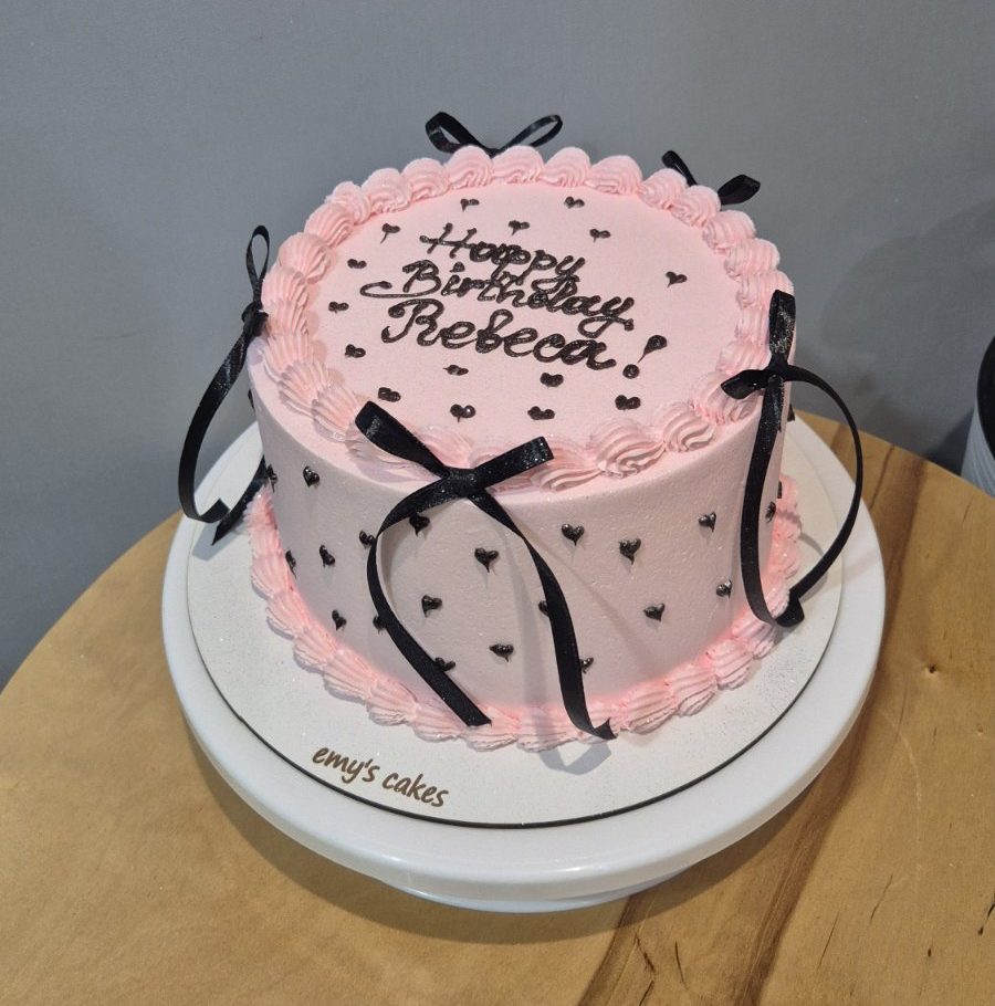 Tort elegant de 2 kg acoperit în cremă de brânză roz pal, decorat cu fundițe negre voluminoase, inimioare negre și inscripție „Happy Birthday Rebecca”. Decorul minimalist costă doar 100 lei. Alege din umpluturile noastre variate pentru o petrecere reușită la Emys Cakes.